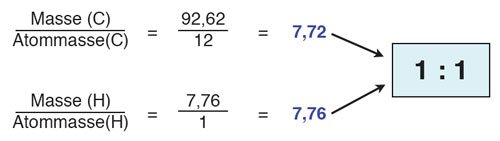 "100 Theile Benzol bestehen … aus: 92,62 Kohlenstoff + 7,76 Wasserstoff, … Sauerstoff ist im Benzol nicht enthalten."Wir wollen aus diesen historischen Ergebnissen nun das Atomzahlverhältnis C : H für das Benzol berechnen.