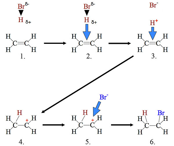 - Das HBr-Molekül wird heterolytisch gespalten, in ein Bromid-Ion und ein Proton. Das Proton wird von der Doppelbindung weiter angezogen, das Bromid-Ion verbleibt im Lösungsmittel.