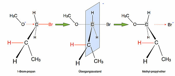 Betrachten wir einmal eine "alltägliche" SN2-Reaktion, nämlich die Umsetzung von 1-Brom-propan mit dem Methanolat-Ion als Nucleophil: