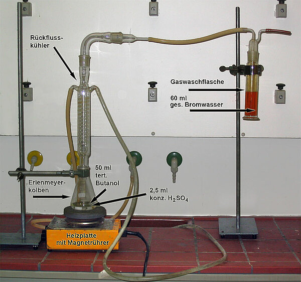 Ein Reagenzglas wird mit ca. 2 ml tert. Butanol und ein paar Tropfen konz. Schwefelsäure vorsichtig erhitzt (Siedesteinchen!). Das entstehende Gas wird in ein zweites Reagenzglas mit Bromwasser geleitet. Dieses Bromwasser sollte nicht allzu konzentriert sein, aber noch deutlich braun gefärbt.
