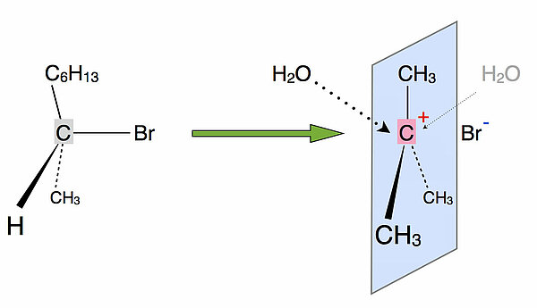 Würde die Reaktion nach dem SN1-Mechanismus ablaufen, wäre ein Racemat zu erwarten, also ein 50:50-Gemisch der beiden Enantiomere. Das Carbenium-Ion, das sich im ersten Reaktionsschritt bildet, ist ja planar und somit von beiden Seiten für das Nucleophil zugänglich.
