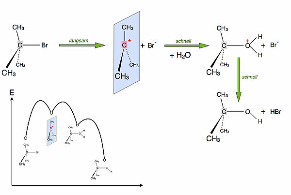 Diese Reaktion läuft nämlich nicht in zwei Schritten ab, sondern in drei. Im ersten langsamen Schritt bildet sich das pentavalente Carbenium-Ion, an das sich dann im schnellen zweiten Schritt ein Wasser-Molekül anlagert. Die Oxonium-Gruppe in diesem Zwischenprodukt ist aber noch recht instabil. Durch Abspaltung eines Protons bildet sich dann im schnellen dritten Schritt das Endprodukt 2-Methyl-propan-2-ol.