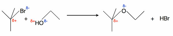 Untersucht man die Kinetik dieser Reaktion, so stellt man fest, dass die Reaktionsgeschwindigkeit nur von der Konzentration des Substrats 2-Brom-2-methylpropan abhängt, nicht aber von der Konzentration des neutralen Nucleophils C2H5-OH: