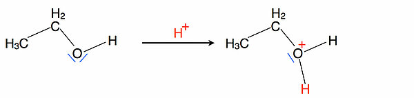 Im ersten Schritt spaltet die Schwefelsäure ein Proton ab, welches sich dann an das O-Atom des Alkohols setzt. Es entsteht ein Oxonium-Ion mit einem positiv geladenem dreibindigen O-Atom - ein äußerst instabiler Zustand, der dann in den Schritt 2 überleitet.