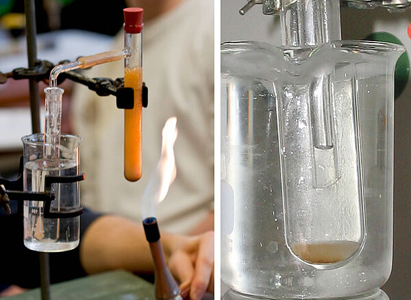 Hier wird der säurekatalysierte Mechanismus der Bromierung von Ethanol besprochen, einem Versuch, den ich früher immer als Schülerversuch in der Stufe Q1 durchführen ließ, nach der Beschreibung in dem alten DDR-Buch "Chemische Schulexperimente" von JUST und HRADETZKY. Bei diesem Versuch, der nach den heutigen Sicherheitsbestimmungen in der Schule nicht mehr durchgeführt werden darf, weil das Reaktionsprodukt zu gefährlich ist, werden 3 ml Ethanol mit 3 g Kaliumbromid und 3 ml konz. Schwefelsäure in einem Reagenzglas erhitzt. Die Dämpfe werden gekühlt und kondensieren dann in einem zweiten wassergekühlten Reagenzglas. Das Reaktionsprodukt tropft in Form dicker milchiger Tropfen in das gekühlte Reagenzglas.