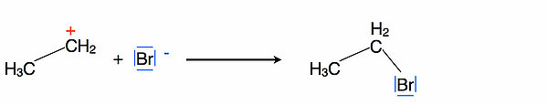 Im dritten Reaktionsschritt lagert sich als Nucleophil ein Bromid-Ion an das Carbenium-Ion an. Es entsteht nur ein Reaktionsprodukt, da das Carbenium-C-Atom nicht chiral ist (es hat nicht drei verschiedene Substituenten, sondern nur zwei verschiedene, nämlich eine Methylgruppe und zwei H-Atome).