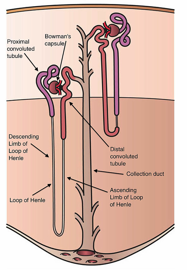 Betrachten wir noch einmal das Bild von der letzten Seite, als es um den Aufbau eines Nephrons ging.