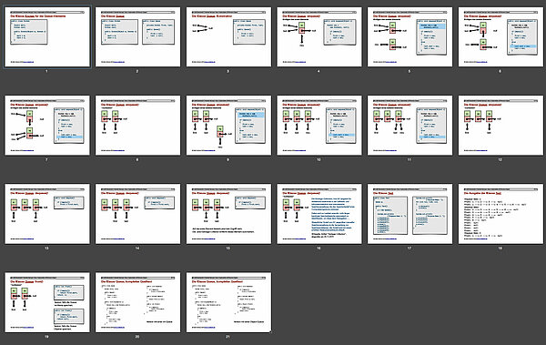 Auf den letzten Folien wird dann eine Testklasse vorgestellt, mit der die Methoden der Queue ausprobiert werden. Die letzte Folie zeigt den kompletten Java-Quelltext der Klasse Queue, allerdings in recht kleiner Schrift.